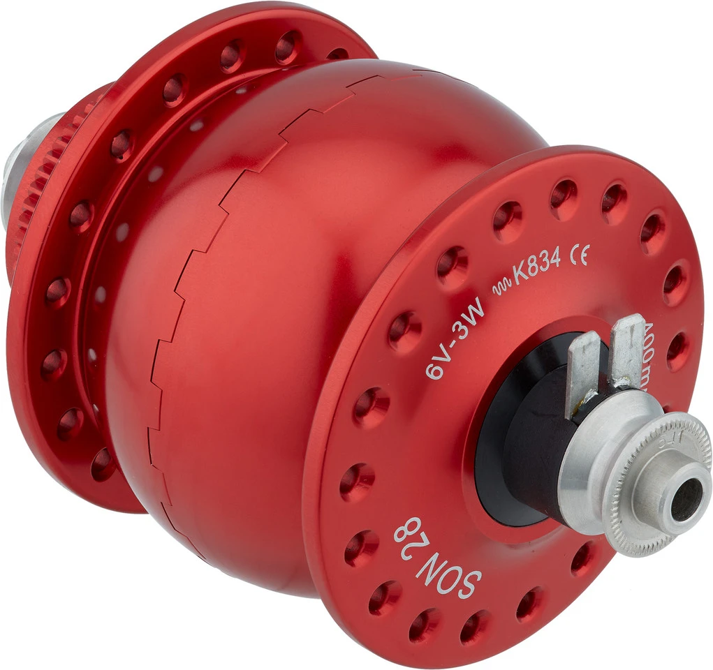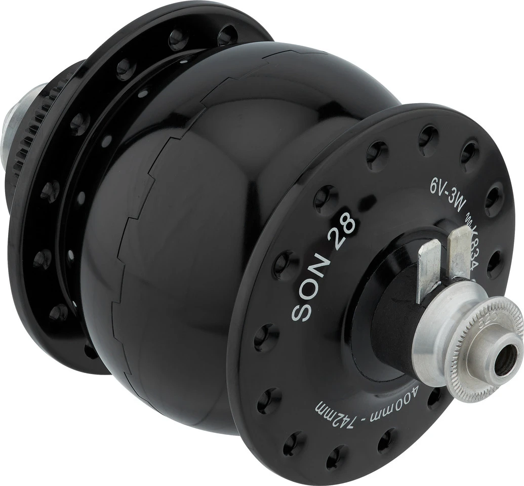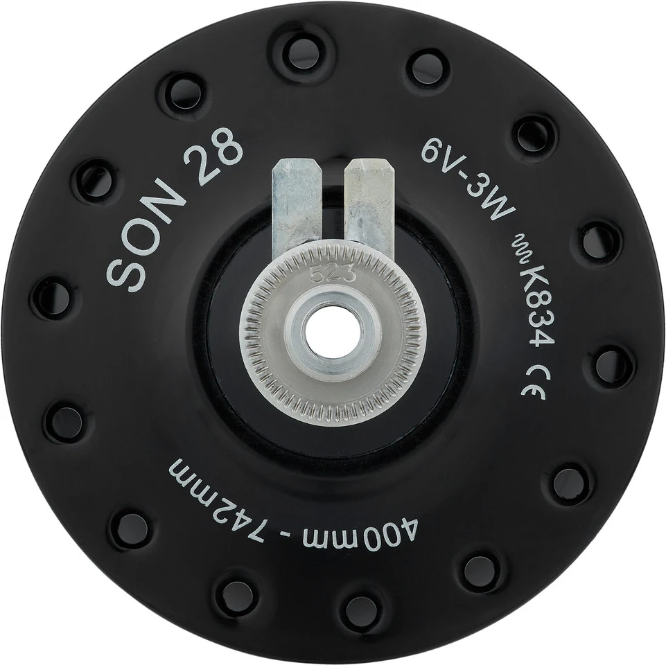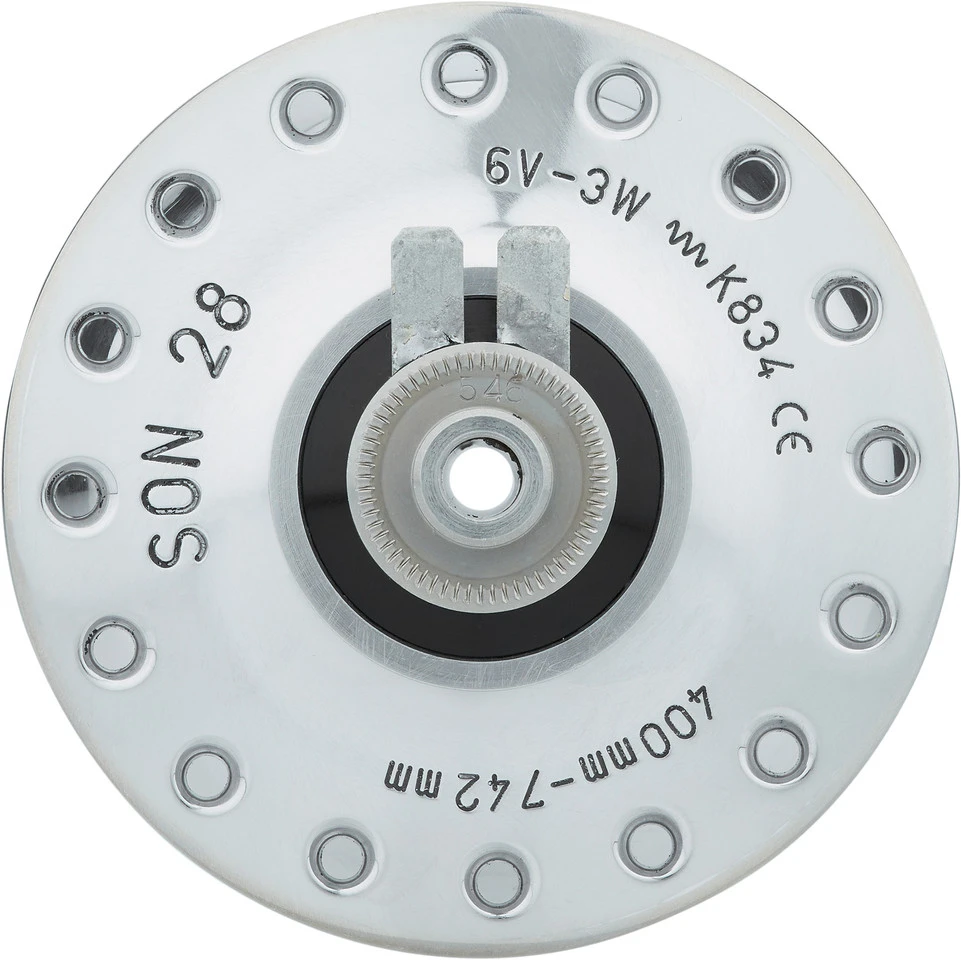 El Son 28 es un dinamo de buje aprobado universalmente para todos los tamaños de ruedas de 16″ a 29″ . Alcanza su potencia nominal en una rueda de 28″ a unos 16 km/h. Por lo tanto, se recomienda si se requiere un nivel de luz particularmente alto cuando se conduce despacio o si se van a utilizar otros dispositivos o se van a cargar sus baterías. En comparación con su predecesor Son clásico, las pérdidas en el ralentí pudieron reducirse en aproximadamente un 15% y el peso en 140 g.