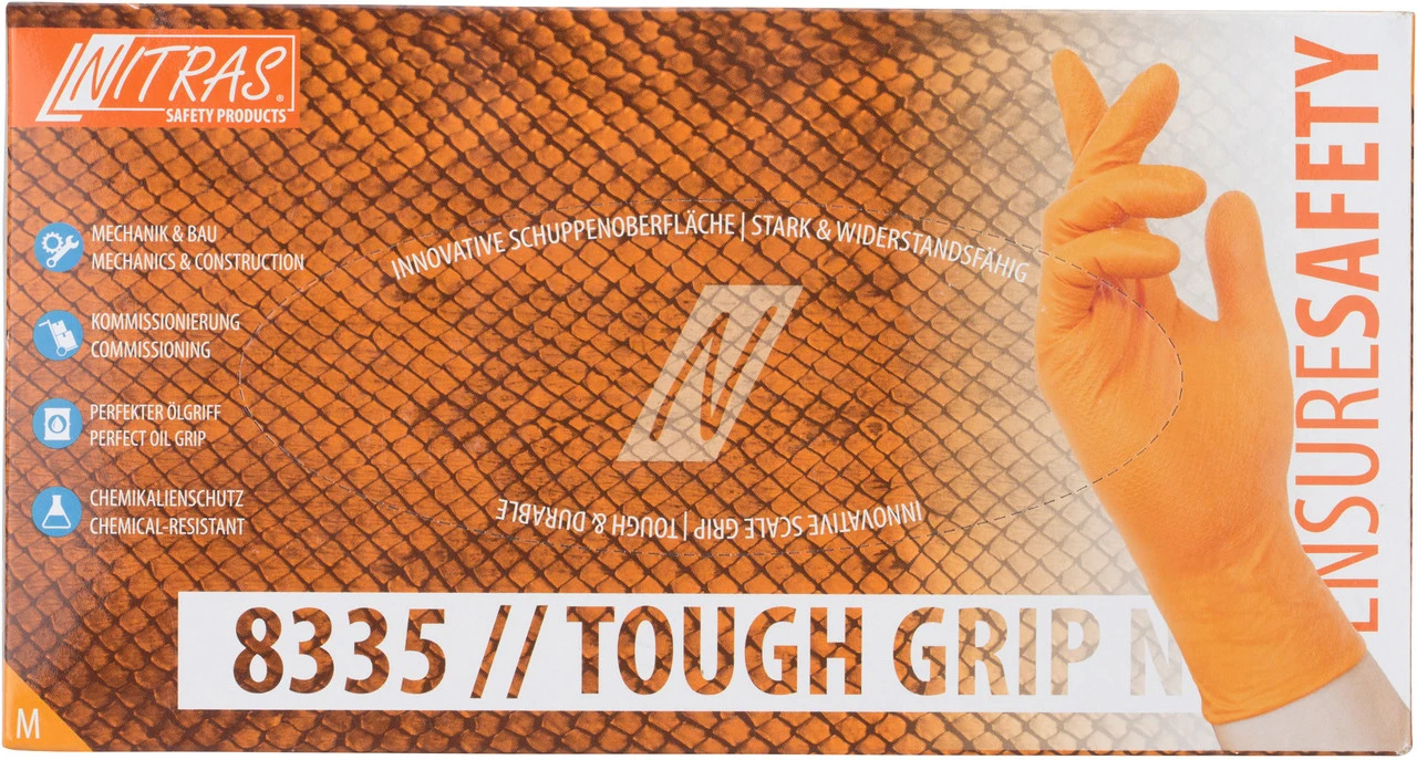 Datos técnicos:Material:NitrilGrosor:0,26 mm (dedo), 0,15 mm (palma)Características:no está esterilizado, libre de polvo, te lo puedes poner en ambas manosajuste preciso, robustoapto para el contacto con alimentosSuperficie escamadaCaja de 50 piezasCertificado EN 374, AQL-volor 1,5Volumen de envío:50 x Guantes desechables 3min19sec